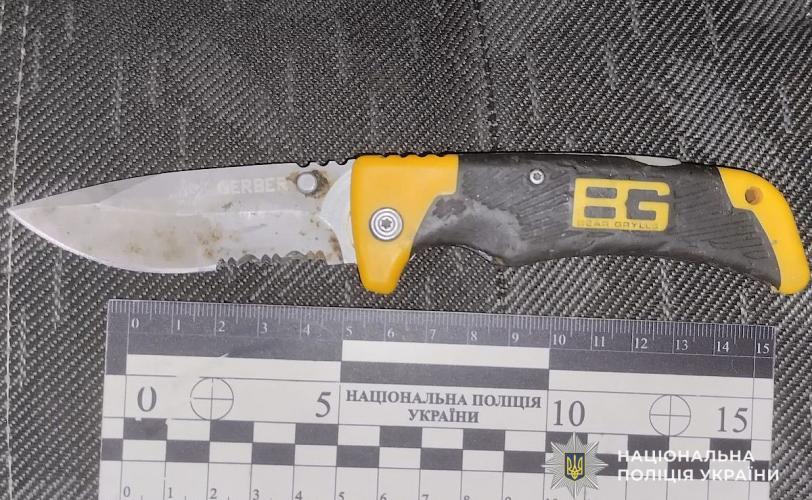 Правоохоронці затримали нападника на місці події у порядку ст. 208 Кримінального процесуального кодексу України. Під час огляду території поліцейські вилучили предмет, ймовірно, використаний як знаряддя злочину — ніж.