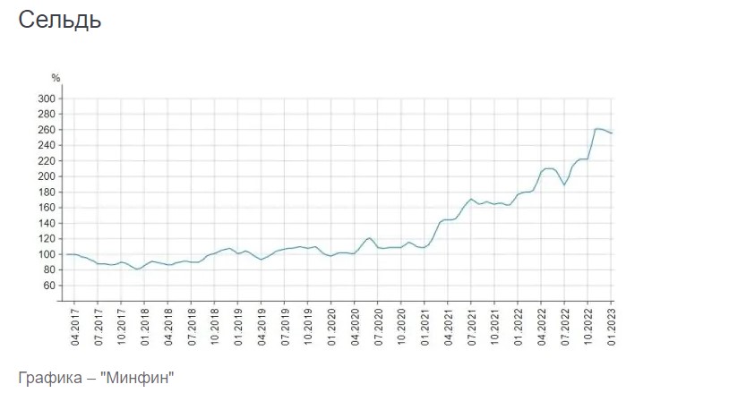 Портал публикует динамику изменения индекса среднемесячных цен на наиболее ходовые виды рыбы — пресноводный карп и морскую сельдь и скумбрию (график с накоплением, растущим итогом с 03.2017). При этом значение индекса было рассчитано по среднемесячным ценам на следующие продукты: