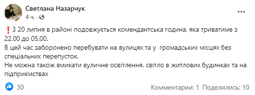 “С 20 июля в районе продлевается комендантский час, который продлится с 22.00 до 05.00. В настоящее время запрещено находиться на улицах и в общественных местах без специальных пропусков. Нельзя также включать уличное освещение, свет в жилых домах и на предприятиях», – сообщила глава РВА.