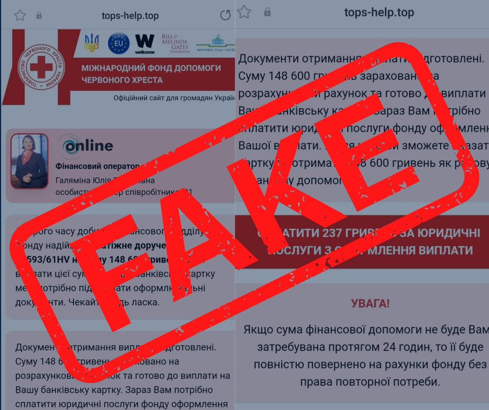 "Сетью распространяется ложная информация о якобы выплатах платежных поручений от Красного Креста Украины на банковские счета граждан после оплаты юридических услуг. Это мошенники, которые с целью сбора средств от граждан и их личной информации, создали фейковый сайт "Международный фонд помощи Красного Креста", - заявляют в организации.