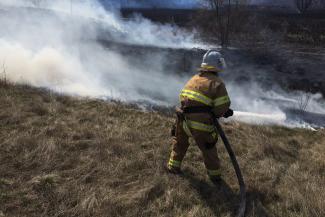 Пожар потушили в 13:15. Огнем уничтожено ориентировочно 1,5 га сухостоя.
