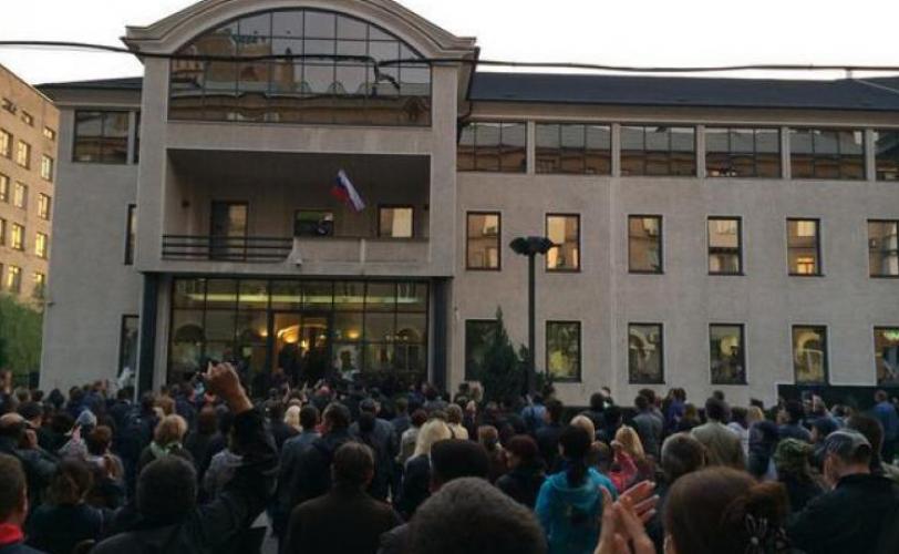 Как сообщил с места события корреспондент, пророссийские активисты разбили окна, двери и, попав в помещение, подняли флаг так называемой «народной» республики.
