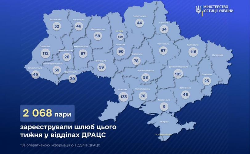 Понад 2000 пар сказали «Так!». За останній тиждень в Україні народилося 2068 нових сімей. Це на 198 щасливих пар більше, ніж попереднього тижня.