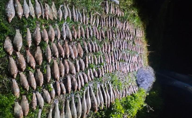 Виявлено громадянина, який здійснював вилов риби у брід забороненими знаряддями. За допомогою 4 сіток порушнику вдалося наловити 156 екз. карася сріблястого, 46 екз. плітки, 17 екз. судака, 15 екз. окуня та 7 екз. плоскирки, загальною вагою 50 кг. Збитки, завдані рибним запасам, становлять 437 937 грн.