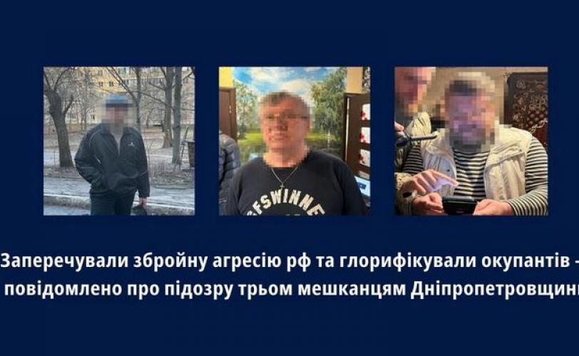 За процесуального керівництва Дніпропетровської обласної прокуратури повідомлено про підозру трьом громадянам за фактом заперечення збройної агресії РФ проти України, глорифікації її учасників (ч. 1, 2 ст. 436-2 КК України). Досудове розслідування у кримінальному провадженні здійснюють слідчі Управління СБУ у Дніпропетровській області.