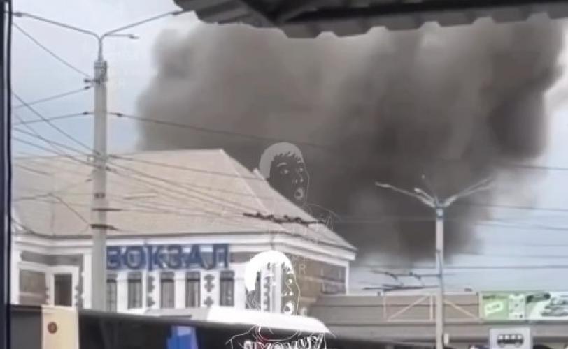 З огляду на відео, удар міг припасти безпосередньо на будівлю вокзалу. На місці влучання спалахнула пожежа, здіймається стовп диму.