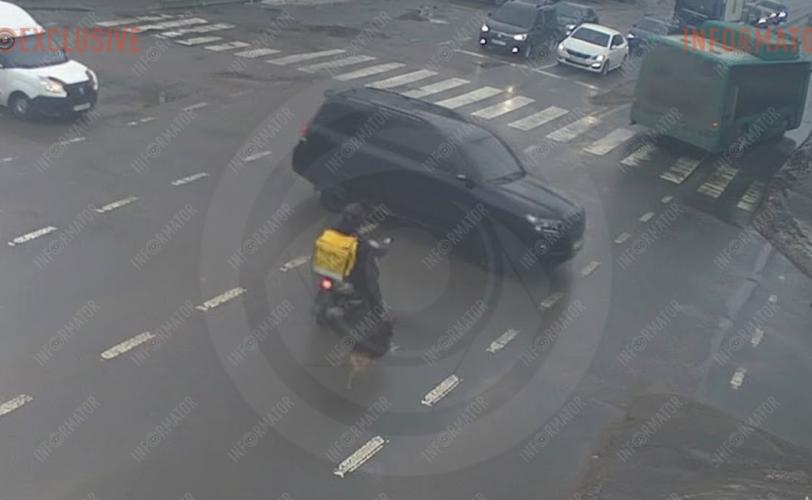 Кур’єр врізався у Toyota, проте не впав, а одразу після зіткнення став на ноги. Песик же злякався і побіг геть. Усі обставини ДТП з’ясовують правоохоронці.