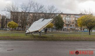 Гілки дерев через шквальний вітер падали на зупинки, дороги, автівки, контактні проводи. Навіть металевий білборд на проспекті Олександра Поля не витримав сили вітру. Про це повідомляє Інформатор із місця подій.