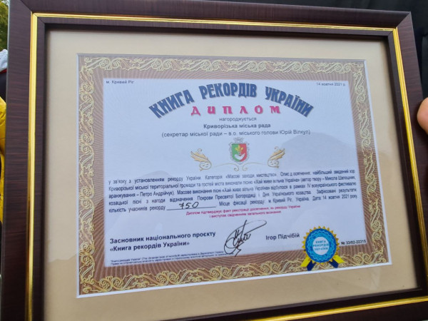 - Мне выпала большая честь зарегистрировать уникальный рекорд. Это не первое достижение Кривого Рога и, я надеюсь, не последнее. Именно сегодня, именно здесь, с участием всех вас, был установлен новый рекорд Украины в категории «Массовые мероприятия искусства». Мы насчитали количество участников рекорда – 750.
