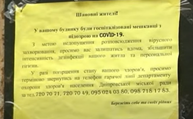 В Днепре на подъездах домов, откуда были госпитализированы жильцы с подозрением на Covid-19, появились соответствующие объявления. Они призывают соблюдать меры предосторожности и немедленно сообщать медикам в случае появления симптомов заболевания.
