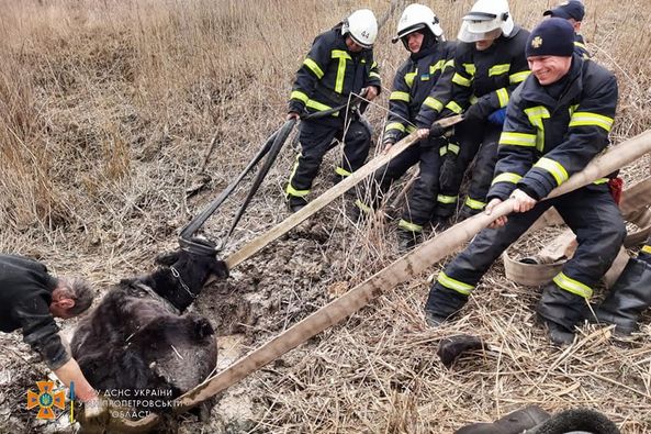 Корову нашли – обессиленное животное погрязло в грязи неподалеку от водоема. Чрезвычайники обвязали корову пожарными рукавами и вытащили из ловушки.