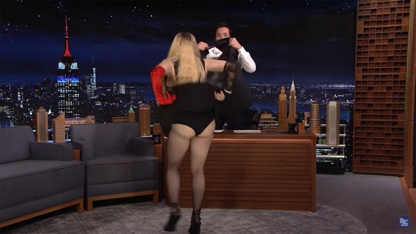 Заявив, что творческие люди существуют для того, чтобы нарушать покой, американская певица неожиданно встала со своего кресла и улеглась прямо на стол ведущего, приняв эффектную позу. Фэллон снял пиджаки и попытался прикрыть филейную часть звезды, приговаривая: «Прекратите это… Я не знаю, что делать», сообщает showbiz.fakty.ua.