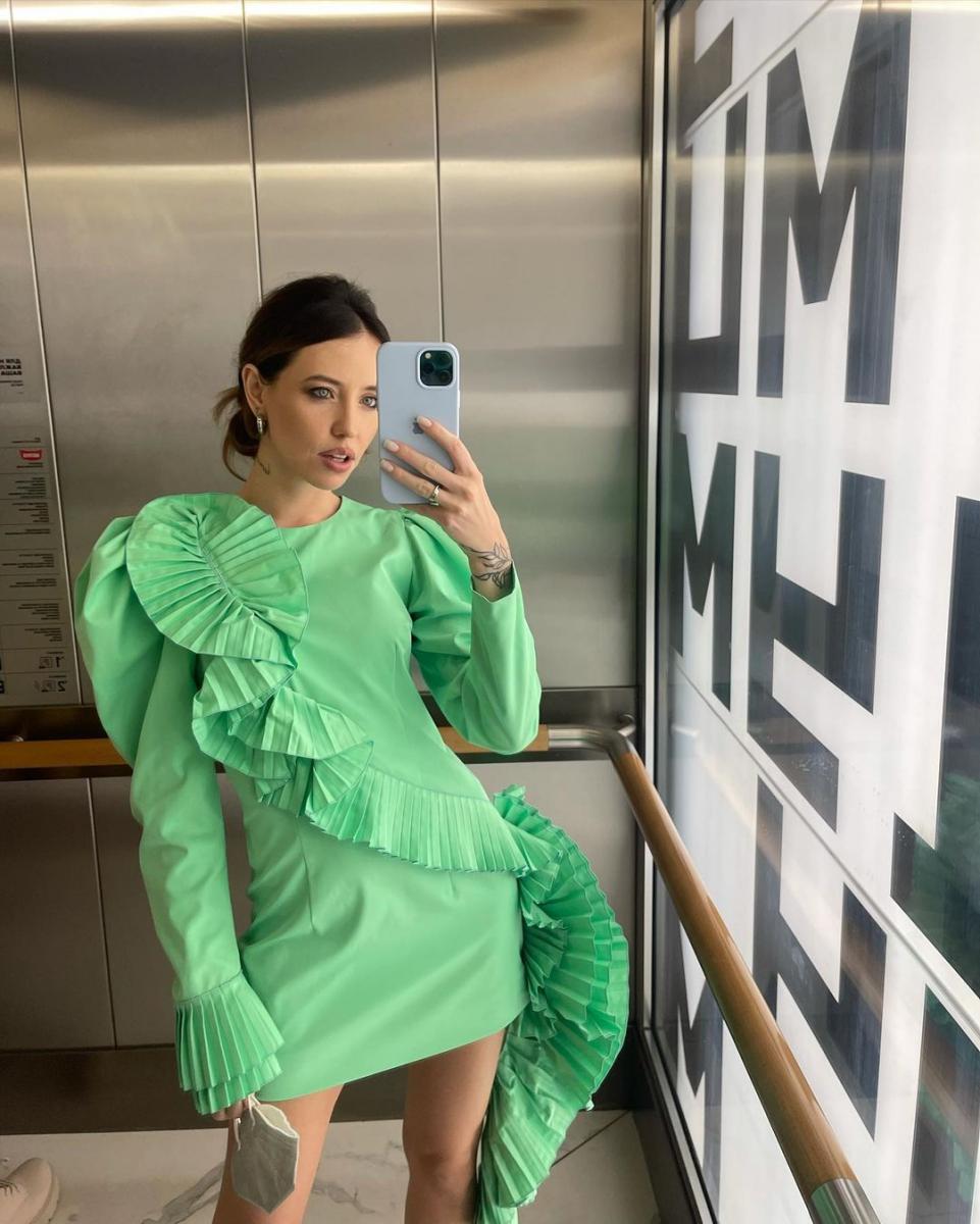 Для светского выхода Надя выбрала оригинальное зеленое мини-платье с длинными рукавами и объемными воланами по всей длине. Один из них эффектно спускается сбоку по бедру.