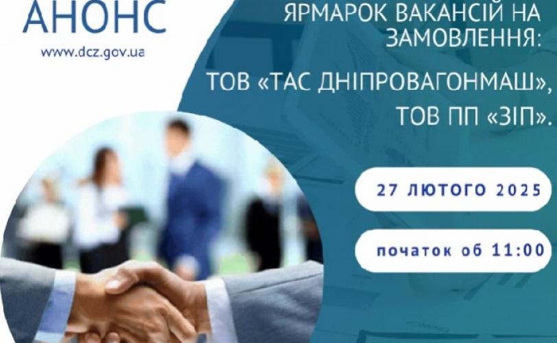27 лютого в Кам`янській філії Дніпропетровського ОЦЗ відбудеться ярмарок вакансій на замовлення роботодавців міста: ТОВ «ТАС ДНІПРОВАГОНМАШ», ТОВ ПП «ЗІП».