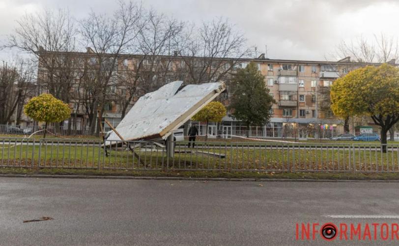 Гілки дерев через шквальний вітер падали на зупинки, дороги, автівки, контактні проводи. Навіть металевий білборд на проспекті Олександра Поля не витримав сили вітру. Про це повідомляє Інформатор із місця подій.