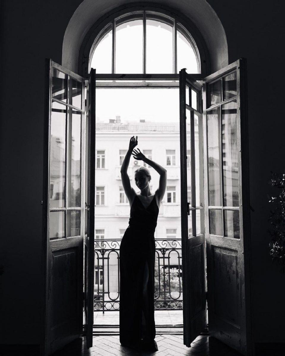 Реп'яхова позувала на балконі з видом на місто у чорній максі сукні у білизяному стилі з пікантним розрізом, який оголив ніжку блогерки. Свій образ Катерина доповнила низьким пучком з волосся, легким макіяжем та мінімалістичними прикрасами.